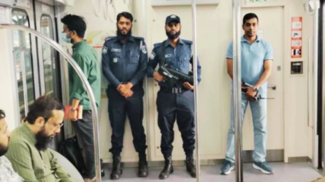 Starting today, two Mass Rapid Transit (MRT) police men will be stationed inside each metro rail coach to enhance passenger security, according to MRT Police Inspector (Operations) Sujit Kumar Gomasta.