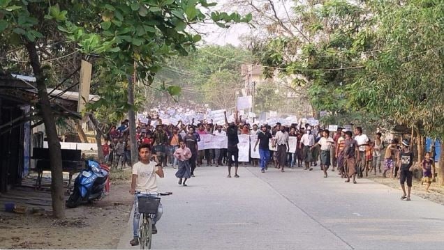 Security and intelligence officials said a group of nearly 500 Rohingyas rallied at Buthidaung Township in Maungdaw District of Myanmar’s troubled Arakan province to mark their stance, denying to be drafted by either the rebels or the government troops.