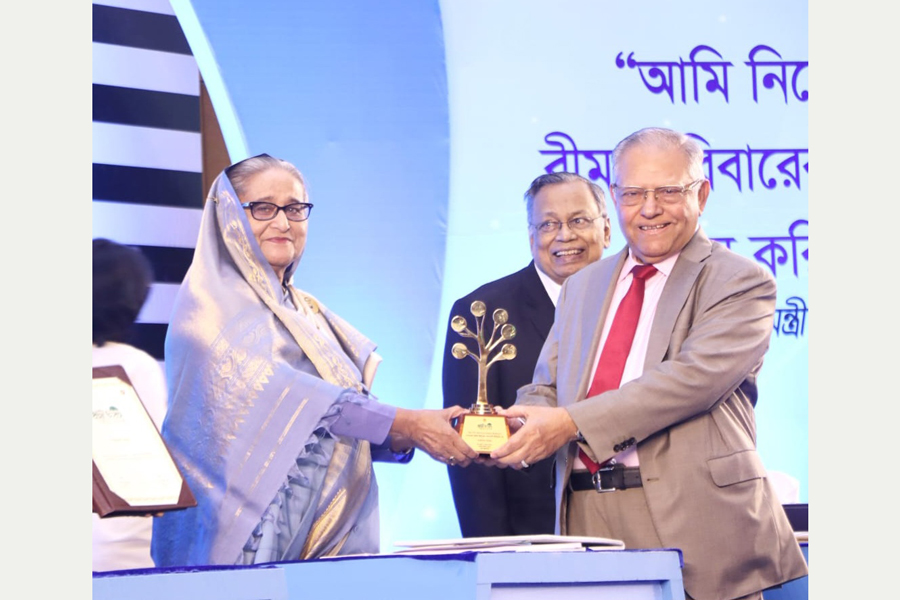 Prime Minister Sheikh Hasina handed over the memento and certificate to Morshed Alam MP, chairman of National Life Insurance, at a ceremony at Bangabandhu International Conference Centre, marking the National Insurance Day, according to a press release.