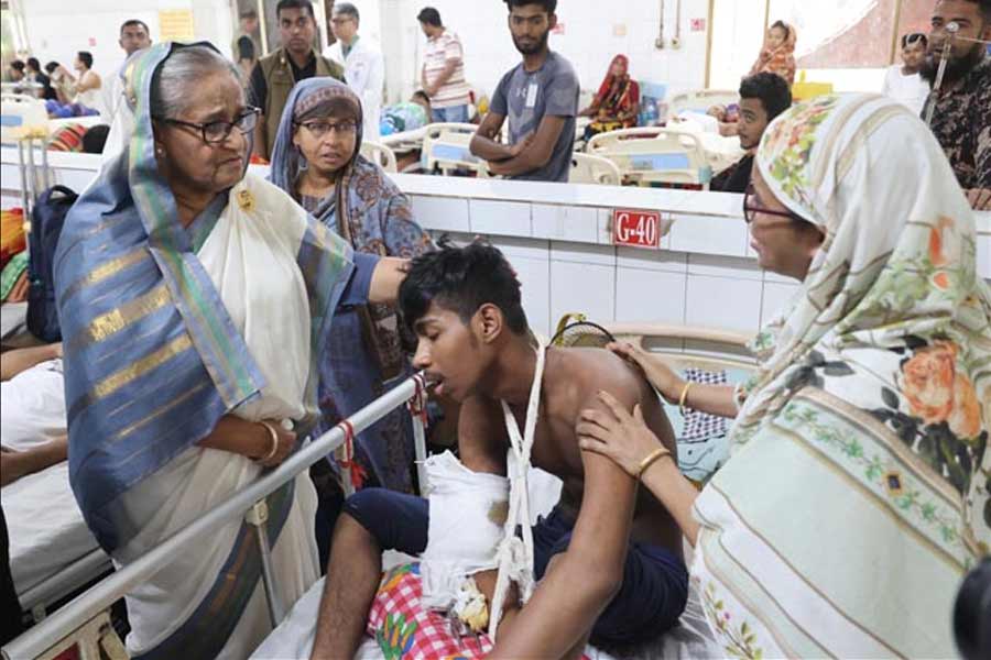 The prime minister on Friday afternoon also visited the Dhaka Medical College and Hospital (DMCH) and enquired about the condition of the injured who came under terror attacks during “total shutdown" programme enforced for quota reform in the government jobs.