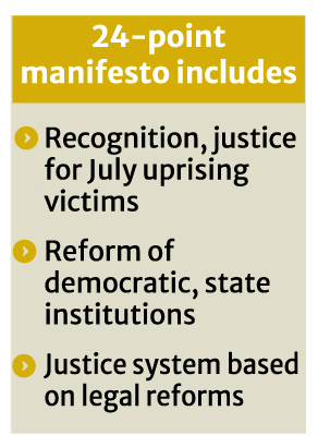 The manifesto includes a new constitution and declaration of the second republic; recognition and justice for the July uprising; reform of democratic and state institutions; a justice system based on fairness and legal reforms; citizen-focused administration and anti-corruption measures; people-friendly law enforcement; village parliaments and empowered local government; independent media and a strong civil society; universal healthcare; an education policy for national development; and investment in research, innovation, and digital revolution.