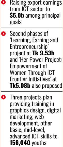 The ICT Division has also proposed the second phase of the 'Learning, Earning and Entrepreneurship' project, estimated at Tk 9.53 billion, and the second phase of the 'Her Power Project: Empowerment of Women Through ICT Frontier Initiatives', estimated at Tk 5.08 billion.