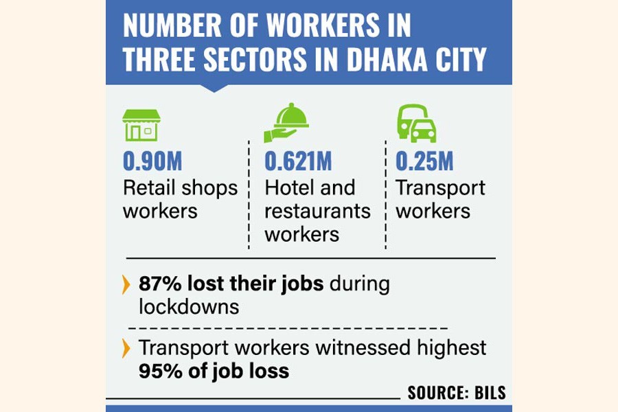 Bangladesh Institute of Labour Studies (BILS) revealed the findings in the report which says nearly 1.8 million transport workers, retail shop workers and hotel-restaurant workers remained three worst-affected groups during the lockdowns amid the pandemic for losing jobs or working hours.