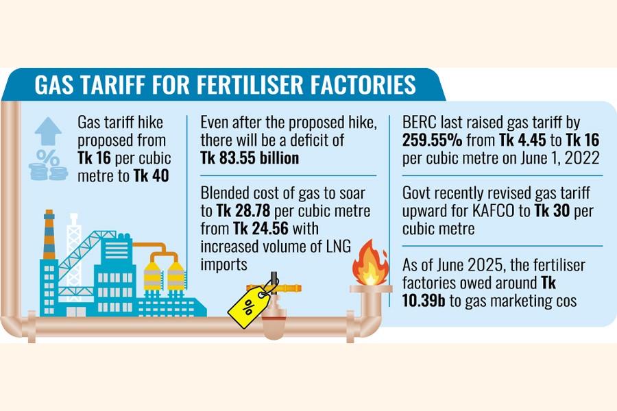The BERC previously had hiked the natural gas tariff for fertiliser factories by 259.55 per cent to Tk 16 per cubic metre from the earlier rate of Tk 4.45, which came into effect on June 1, 2022.
