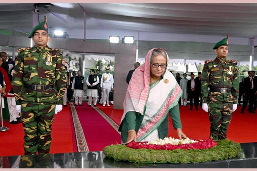 Earlier in the morning, she paid homage to the Liberation War martyrs by placing wreath at the National Memorial in Savar on the outskirts of the capital marking the 54th Independence and National Day.
