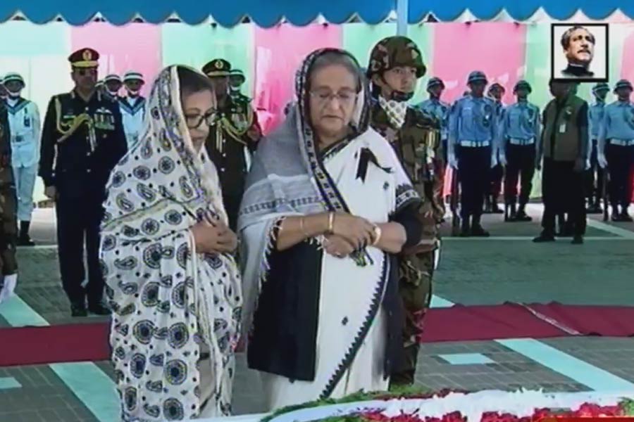 Along with her younger sister Sheikh Rehana, the premier then offered Fateha and munajat at the grave seeking eternal peace of departed souls of the Father of the Nation Bangabandhu Sheikh Mujibur Rahman, Bangamata Begum Fazilatun Nesa Mujib and other martyrs of August 15. Speaker, cabinet members, chiefs of the three services, IGP and prime minister's family members were present.