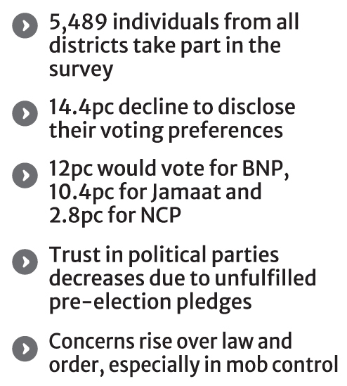 Besides, nearly 14.4 per cent of respondents declined to reveal their voting preferences, according to the survey titled 'Pulse Survey: July 2025 - Citizens' Perceptions, Expectations, and Experiences'. The findings were shared at a meet-the-press event organised by the BIGD and the citizens' platform 'Voice for Reform' at National Archives Auditorium in the city's Agargaon area on Monday.