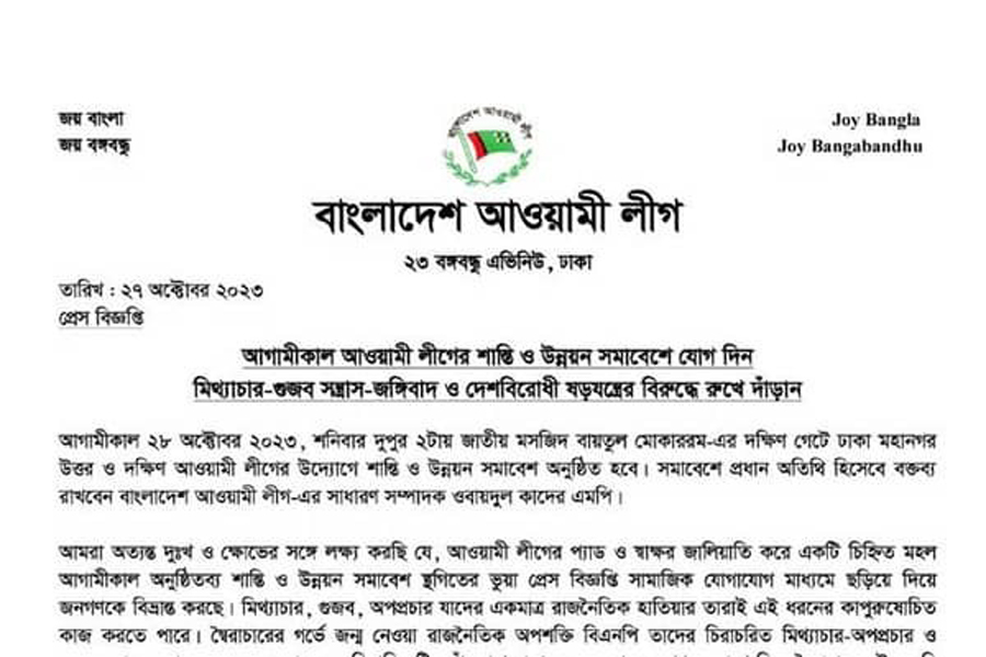 In response, the ruling party expressed disappointment and anger at a 'certain quarter' for misleading the public by disseminating a fake press release about the rally, using the Awami League's letterhead and forged signatures.