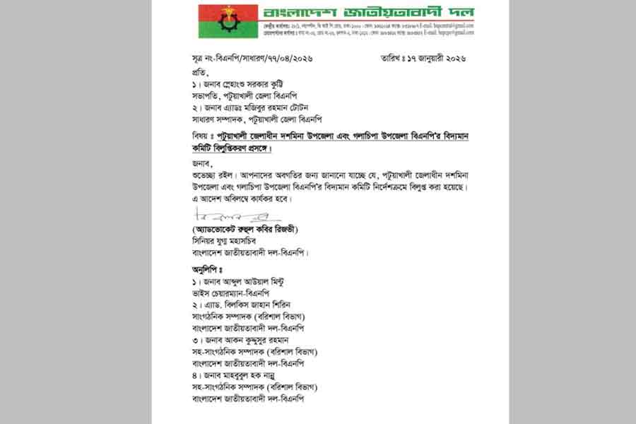 The order, signed by senior BNP Joint Secretary Ruhul Kabir Rizvi on Saturday, was confirmed by Patuakhali district BNP Secretary Mozibur Rahman Toton.