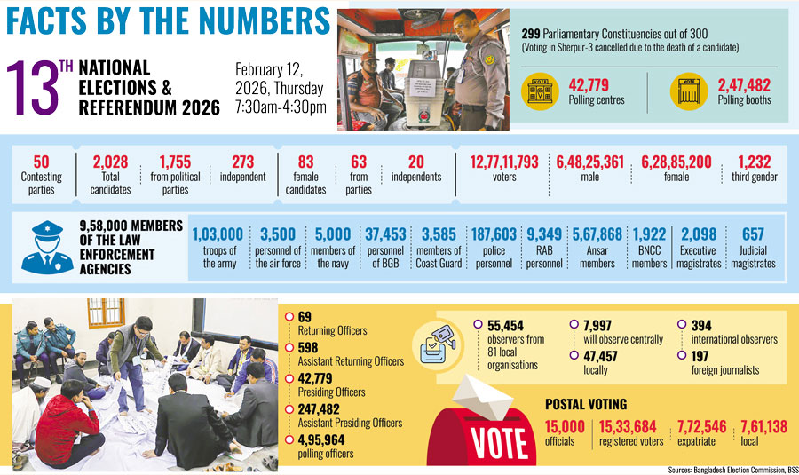 The scale of security deployment reflects both the stakes and lingering anxieties. About 958,000 law-enforcement personnel have been mobilised nationwide, including 103,000 army troops, 3,500 air-force personnel and 5,000 navy members. Police, Rapid Action Battalion officers and nearly 568,000 Ansar members will be on duty, alongside Border Guard Bangladesh and coast guard units.
