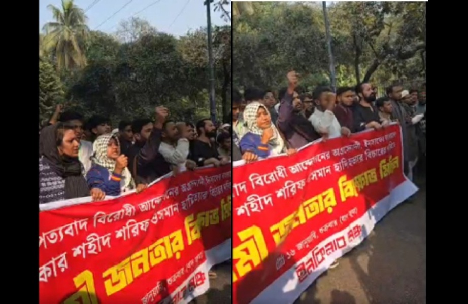 Inqilab Moncho on Friday staged a demonstration demanding justice for its slain spokesperson, Sharif Osman bin Hadi, with a large number of protesters in attendance.
