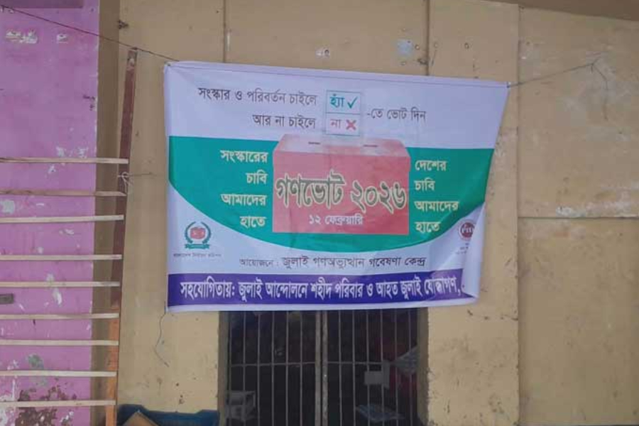 Two banners were put up, one carrying a condolence message for Khaleda Zia and the other highlighting the referendum.
