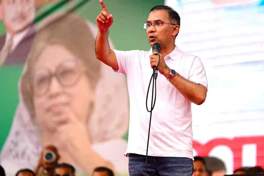 Arriving on stage at Altafunnesa Playground in Bogura town around 5pm on Monday, BNP chief Tarique Rahman was greeted with waves of applause from thousands of supporters. The smiling prime minister acknowledged the crowd, waving back in response.