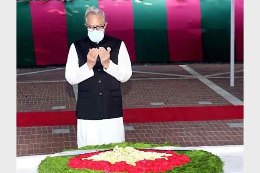 Accompanied by his family members, including his eldest son Engineer Rezwan Ahammad Taufiq, MP, and Bangabhaban officials, the President offered fateha and joined a munajat (doa) seeking eternal peace of the departed souls of the Father of the Nation, Bangamata Begum Fazilatunnesa Mujib and other martyrs of the August 15, 1975 massacre.