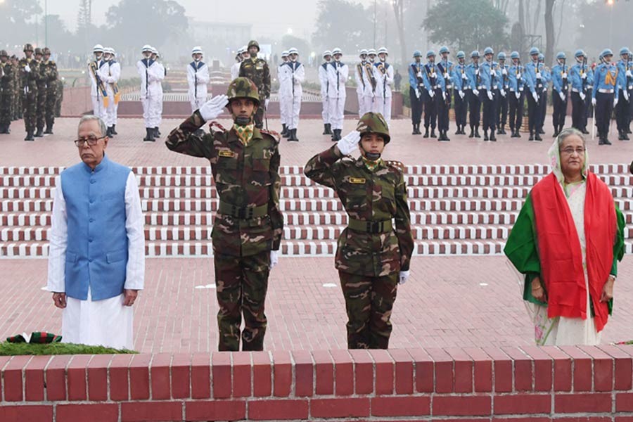 President Abdul Hamid and Prime Minister Sheikh Hasina on Monday paid tributes to the martyrs of the Liberation War by placing wreaths at the National Memorial marking the 49th Victory Day.