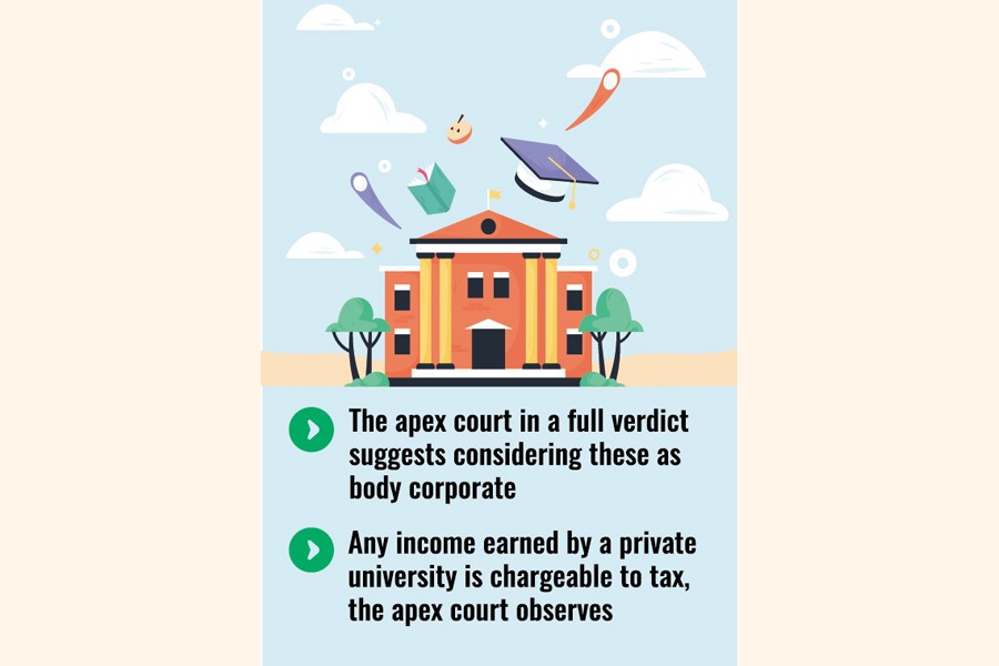 "The observation of the High Court Division that tax on private universities will increase the education cost of the students is not correct, since income tax is a direct tax payable only when a private university earns income, in case of loss no tax is payable," said the apex court.