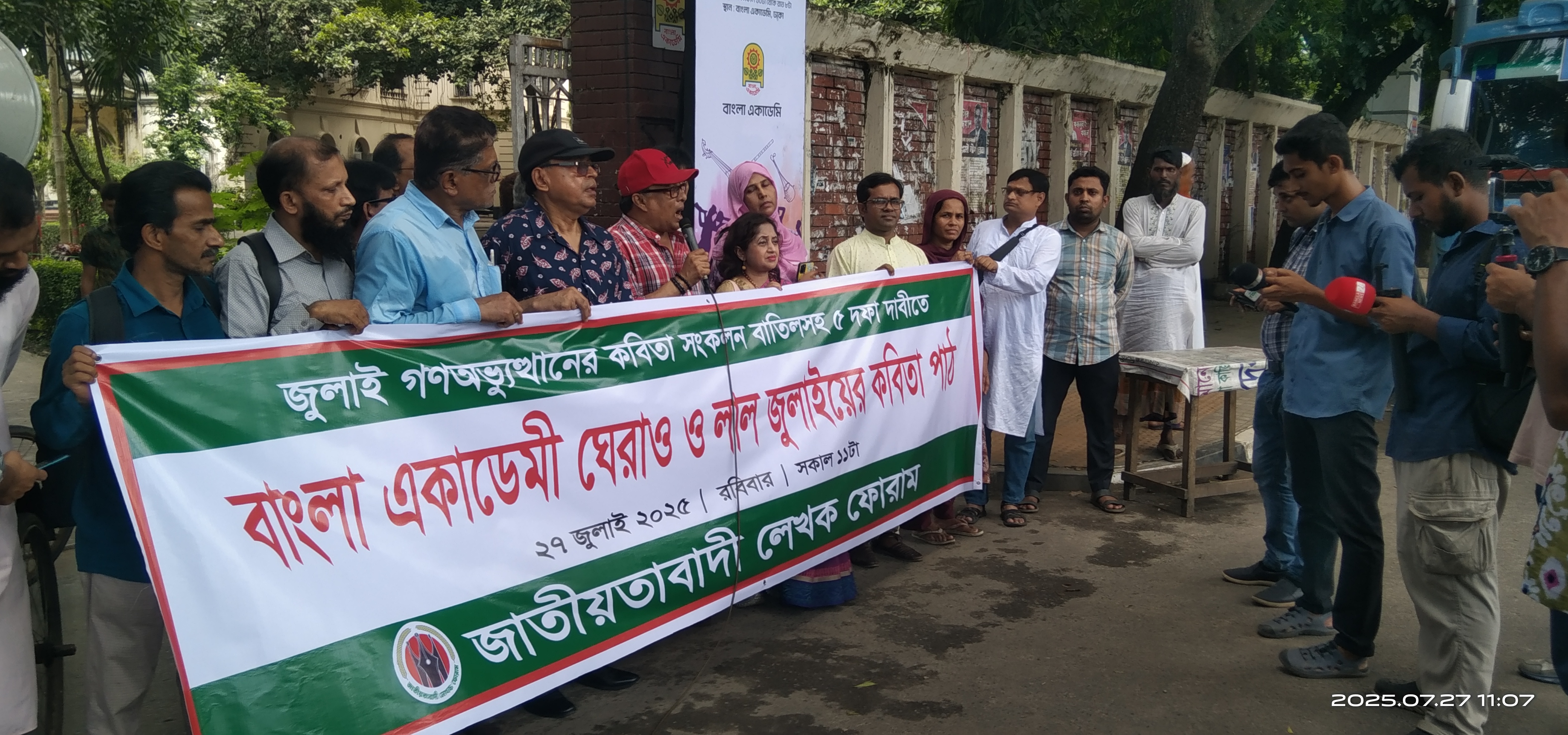 ‘Jatiyatabadi Writers’ Forum’ on Sunday laid a siege to Bangla Academy on Sunday morning to press home their five-point demand, including the withdrawal of the poetry collection titled ‘July Ganoubhyutthan Kobita (Poems of the July Uprising).’