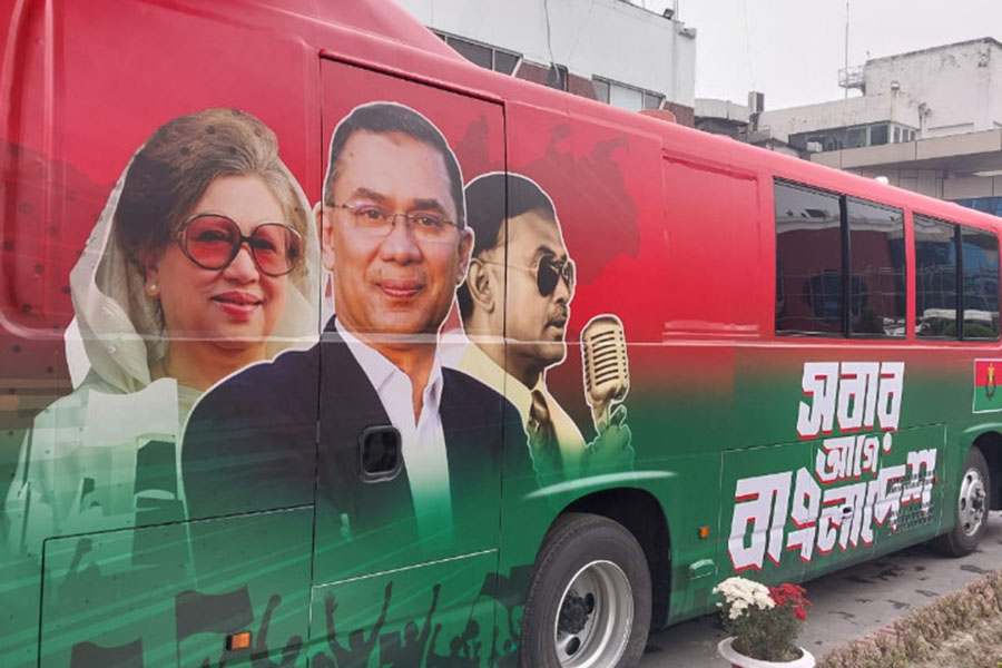 A red bus bearing the slogan ‘Bangladesh First’ has been kept ready in front of the VIP terminal of Hazrat Shahjalal International Airport ahead of BNP Acting Chairman Tarique Rahman’s onward journey.