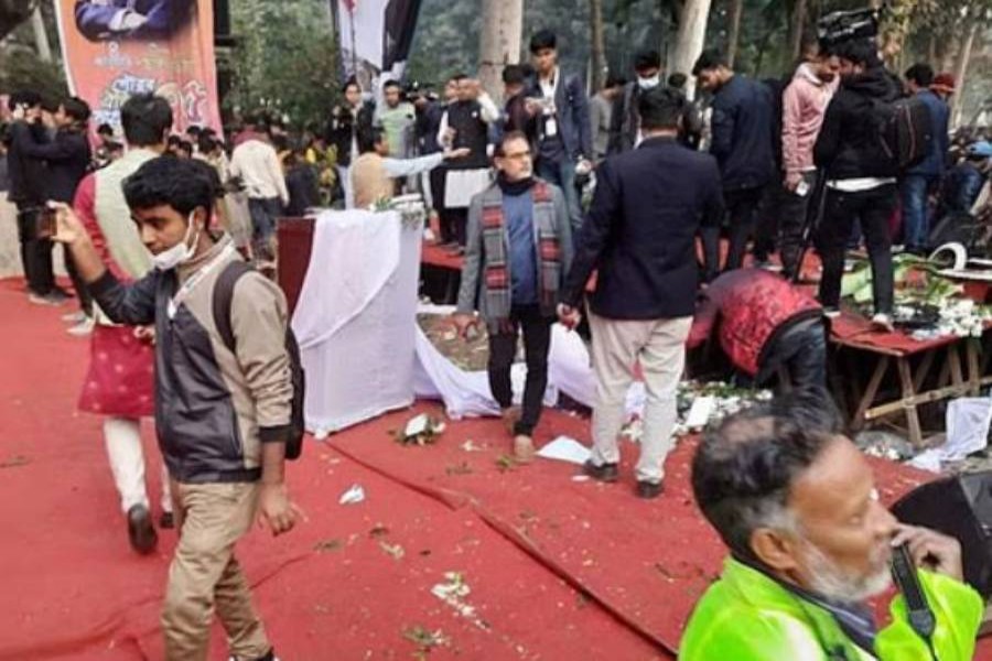 Awami League General Secretary Obaidul Quader was delivering his address at the altar of Dhaka University's Aparajeya Bangla sculpture on Friday when the stage suddenly caved in under the weight of the crowd.