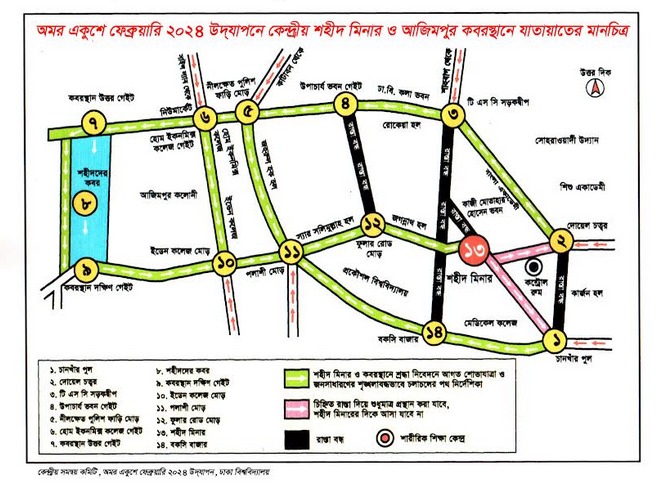 According to the route, people will be able to enter Azimpur graveyard through the old High Court road, Doyel Crossing, Bangla Academy, TSC crossing, the road beside the Vice-Chancellor's residence, New Market crossing and the north gate of the graveyard.
