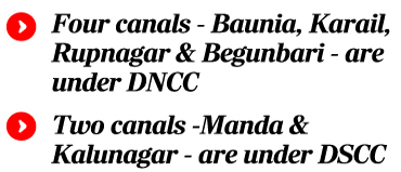 Of the six, four canals Baunia, Karail, Rupnagar and Begunbari are under the jurisdiction of Dhaka North City Corporation (DNCC) and Manda and Kalunagar are under the authority of Dhaka South City Corporation (DSCC).
