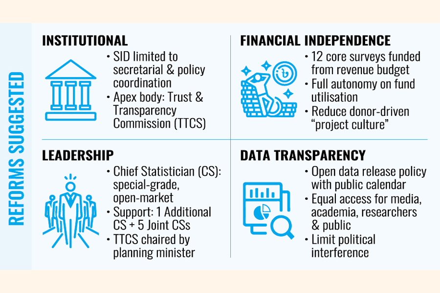Regarding data trust, the taskforce observed that political interference in data release has undermined BBS's credibility. It called for an open data and release policy with a public calendar for all statistical publications, ensuring equal access for government, media, academia, researchers and the public.