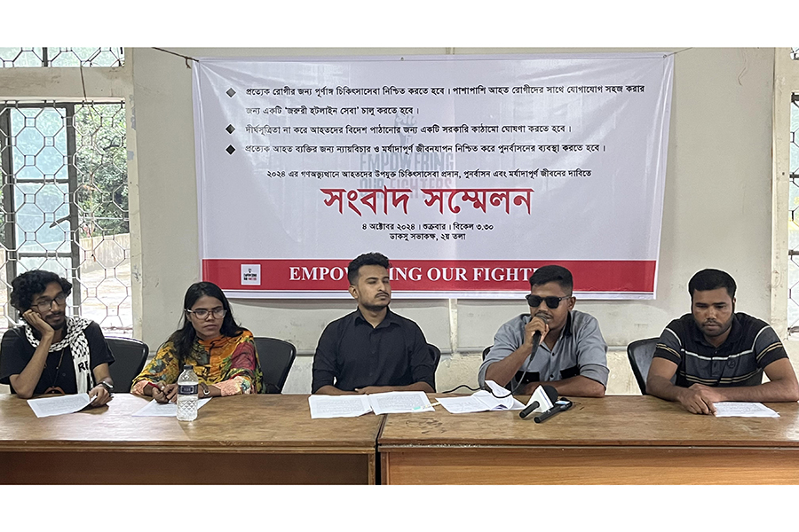 Injured people and students from different universities under the banner 'Empowering our fighters' on Friday placed a six-point demand regarding the treatment and rehabilitation of wounded people in the student-led mass upsurge.