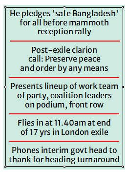 At a mammoth reception rally on return home Thursday amid an ambiance of post-uprising unrest, the Bangladesh Nationalist Party (BNP) acting chairman urged citizens to preserve peace and public order "by any means", calling for unity and restraint.