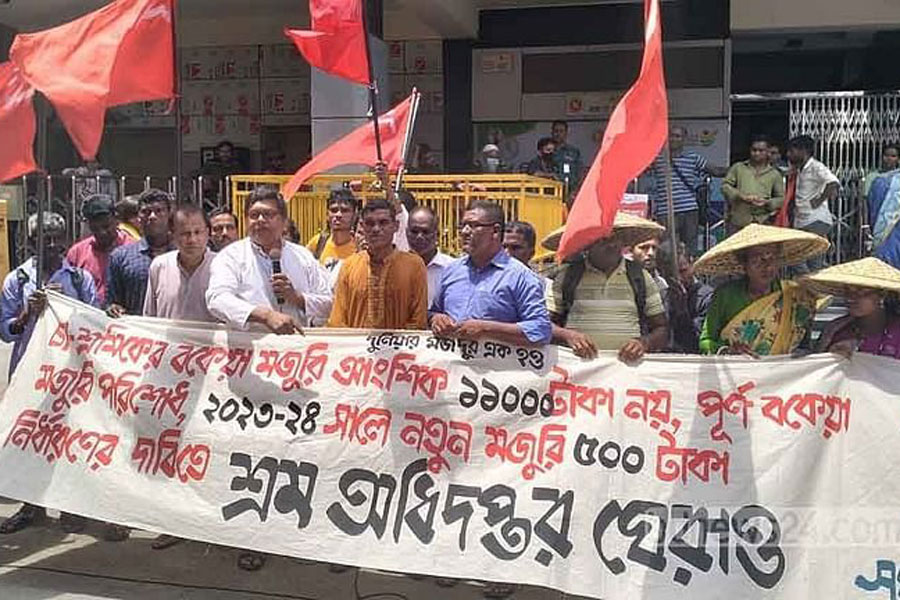 Tea estate workers have demonstrated outside the Department of Labour in Dhaka to press home a series of demands, including a minimum daily wage of Tk 500 and back pay.