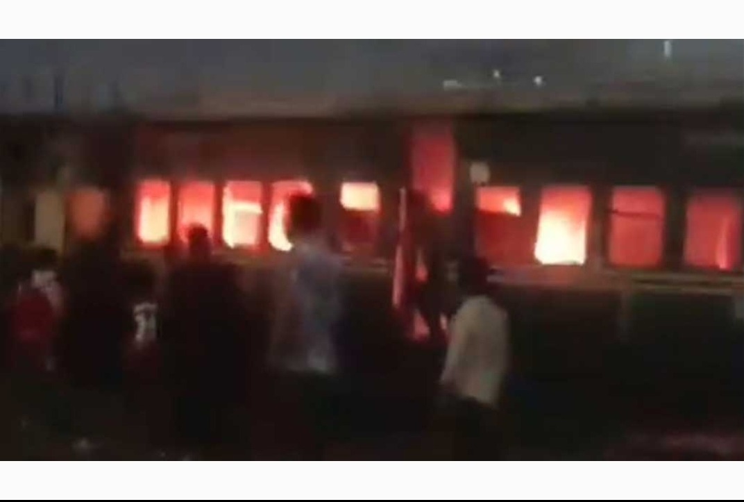 A video circulating on social media shows flames engulfing an empty carriage of the parked train, reports bdnews24.com.