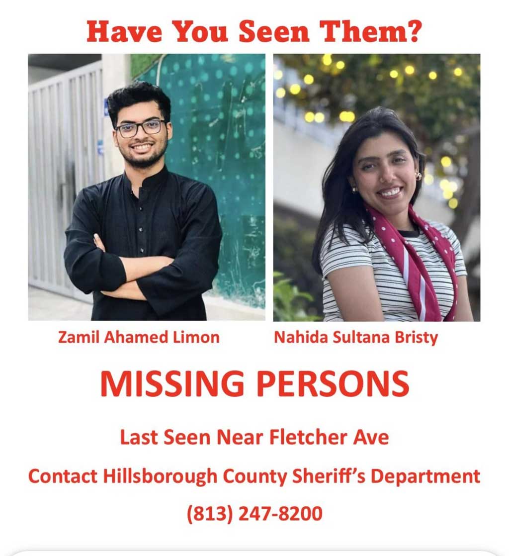 The two Bangladeshi students of University of South Florida -- Zamil Ahamed Limon and Nahida Sultana Bristy -- have been missing for seven days.
