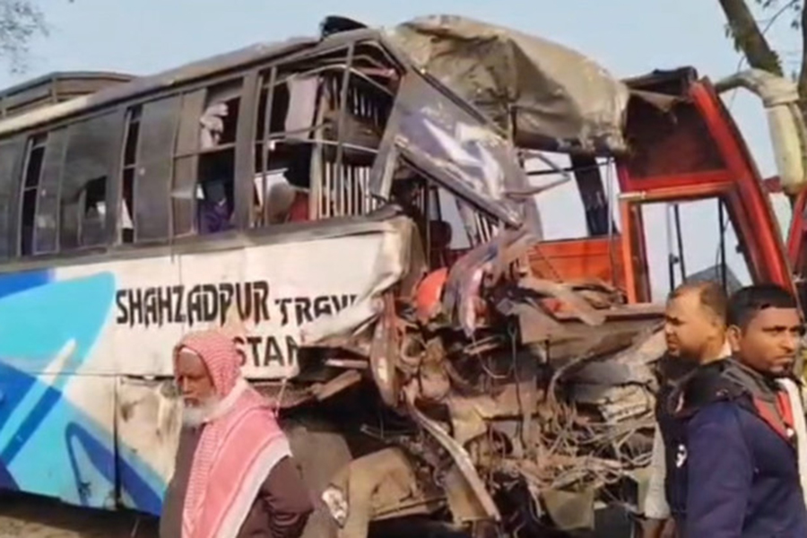 Madhpur Highway Police chief (OC) Mustafizar Rahman said a Shahjadpur Travels bus was heading to Dhaka from Pabna in the morning. Near the Sholabarhia Bridge, it collided head-on with a Machhranga Paribahan bus coming from the opposite direction.