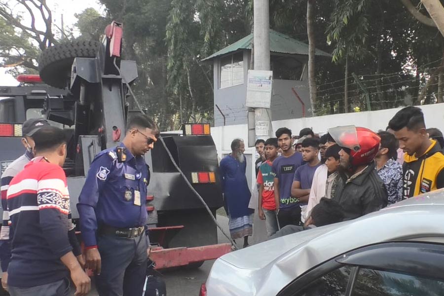 Md Saifuzzaman, sub-assistant director of Satkhira Fire Service, said the accident occurred at 8 am in front of BGB headquarters in Sadar upazila when the Khulna-bound truck hit the private car, leaving it mangled and two passengers and the driver in it injured.
