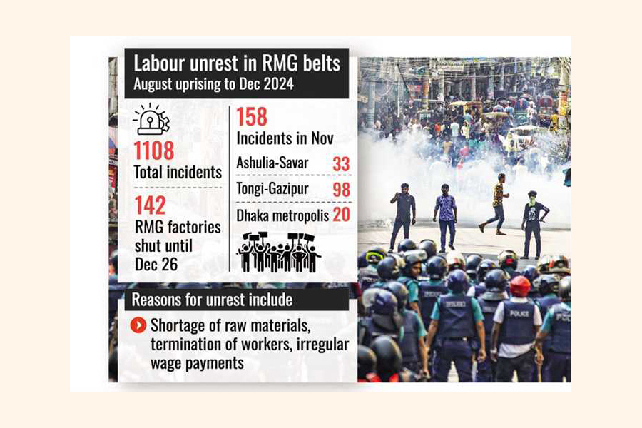 The report has recorded some 1108 such incidents during the period across major industrial belts while a total of 158 labour unrest reported in November with the highest 98 incidents in Tongi- Gazipur belt followed by 33 in Ashulia and Savar and 20 in Dhaka metropolitan city over issues of due wage payments, among others.