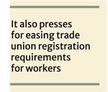 It also presses for easing trade union registration requirements for workers and a fair minimum wage process for garment workers.