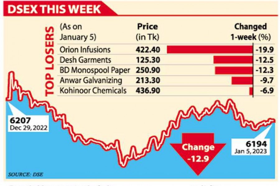DSEX, the benchmark index of the Dhaka Stock Exchange (DSE), settled the week 12.85 points, or 0.21 per cent, lower at 6,194. It gained 4.60 points in the week before.