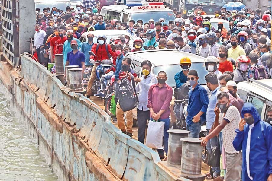 At Shimulia ferry terminal, people were hiring auto-rickshaw to reach their destinations. But there was not enough transportation for everyone because of government restriction, forcing many to walk.