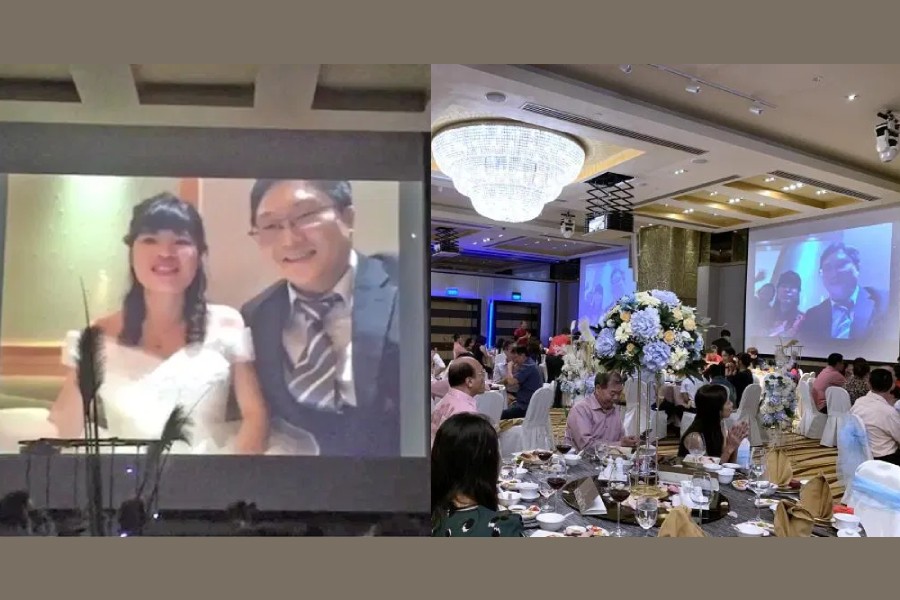 On the evening of 2 February, the couple dialled into the wedding from where they were staying - one of the rooms at M hotel where the wedding was held.