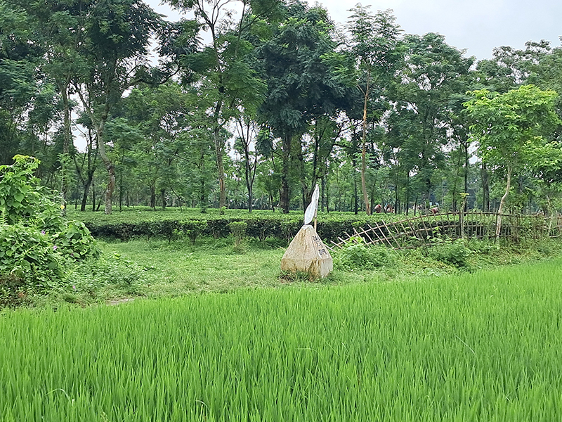 From the school's silver-coloured gate, another autorickshaw carries me to Angarpota. Driving past a Border Guard Bangladesh camp, the driver takes a wet, earthen path and stops where it is no longer accessible by the vehicle. Getting off, I follow him to the last milestone of Angarpota, installed in the front yard of the last house in the area.