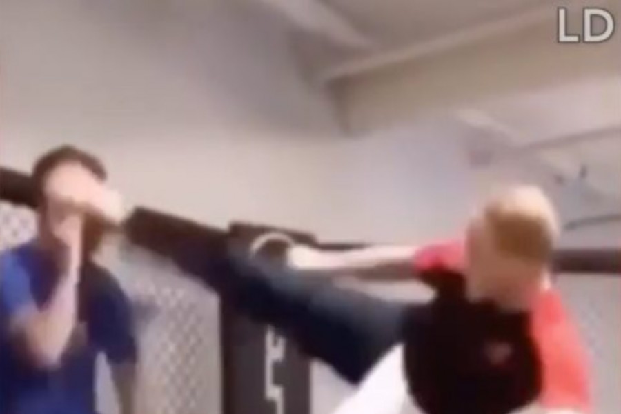 After sweating on everyone and bewildering the team with some strange stretches, the action star got in the training ring with Garbrandt to do some kicks, which is where things went wrong.