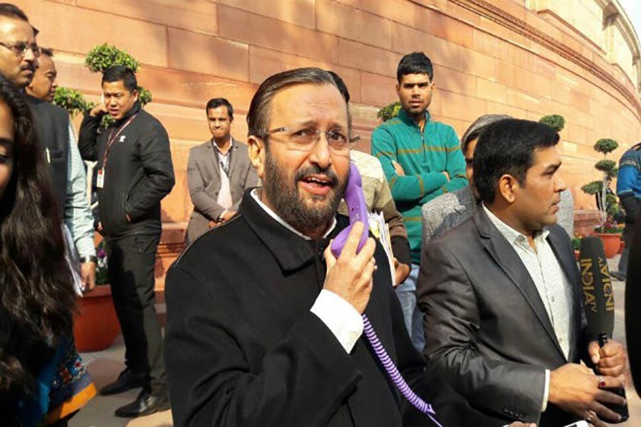 Indian Union Minister Prakash Javadekar was captured in camera using a landline-receiver in order to avoid the harmful radiation released by mobile phones, outside the Parliament, on Friday.