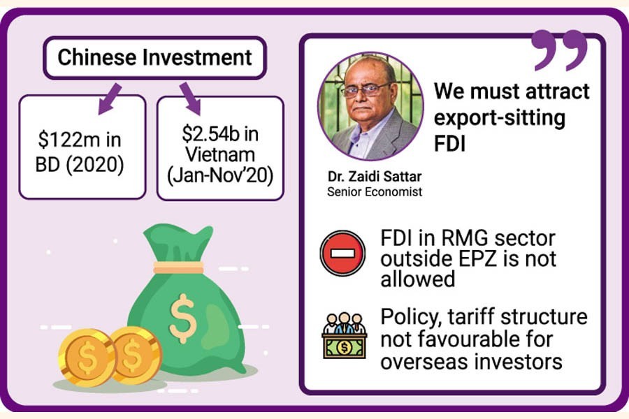 An expected diversion of Chinese investment to Bangladesh shied away in 2020, though local economists and businesspeople were very optimistic on it when the United States of America (USA)'s Trump administration imposed trade restrictions on Chinese products.