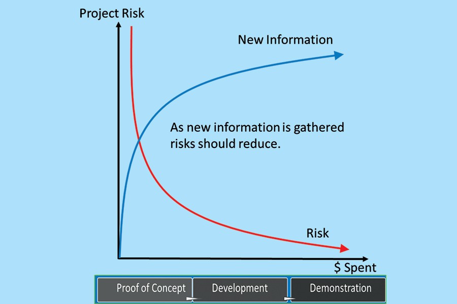 When investment opportunities with suitable risk-return profiles are identified and projects initiated, it is vital that the tasks that reduce risk the most are tackled as early as possible. It should be remembered that at the start of any true innovation project, aimed at bringing a world first to market, the risk can be relatively high and therefore the probability of a successful outcome low. Ideally, risk should exponentially decay over time as resources are spent on the project and new information is created. If risk isn't reducing, the project should be reviewed and redirected or terminated.
