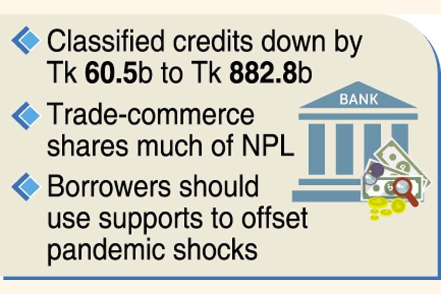 Besides, the amount of classified loans decreased by Tk 60.5 billion to Tk 882.8 billion as of December 31, 2020.