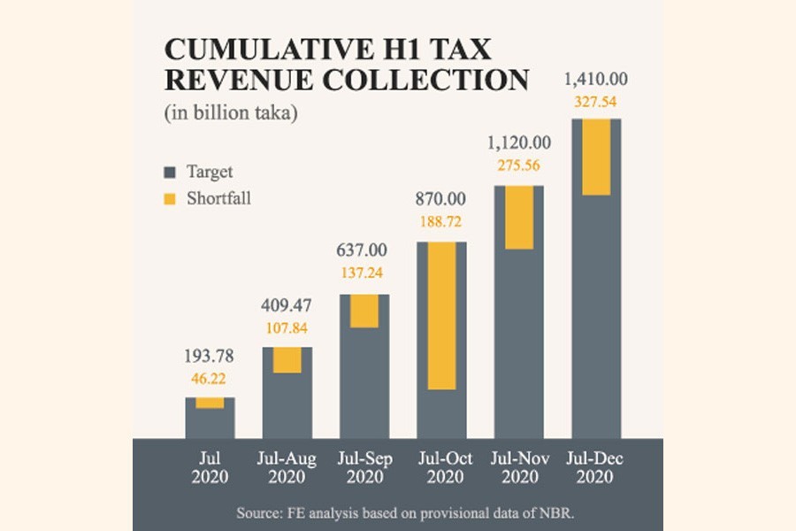 In December 2020, the NBR collected Tk 213.77 billion revenue against its target of Tk 282.65 billion.