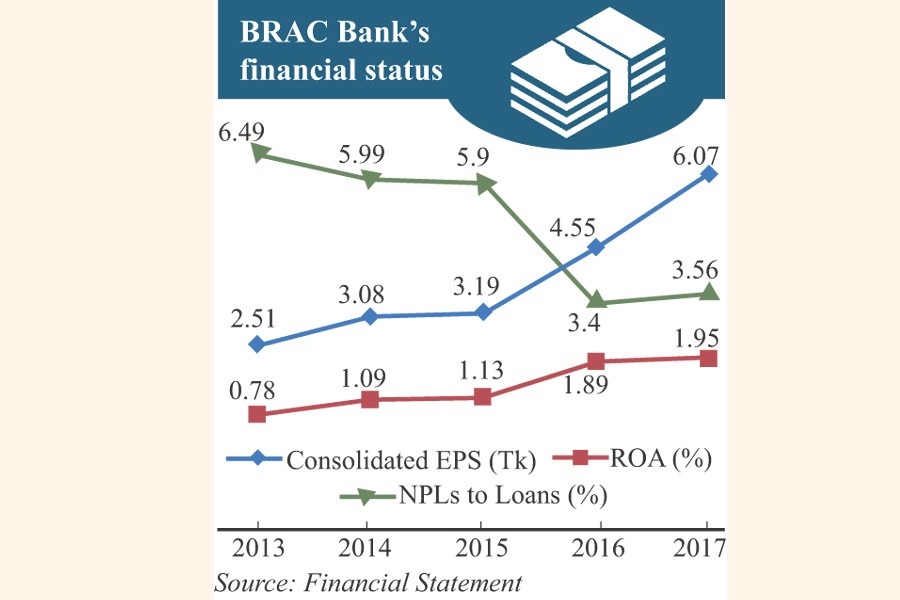 He said the bank witnessed a moderate growth of earnings in 2017 based on 'strong' performance culture introduced by the management. The company's consolidated earnings per share (EPS) gradually rose from Tk 2.51 in 2013 to Tk 6.07 in 2017.