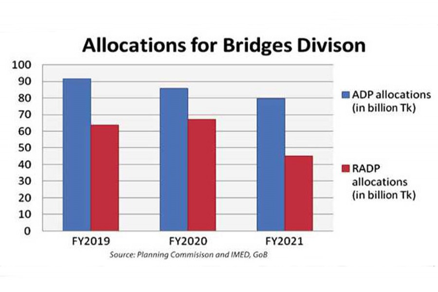 The Bridges Division is the ninth largest development budget holder among all the ministries and divisions, as the agency received 19.80 per cent of the total Tk 2.14-trillion ADP outlay for implementing its projects.
