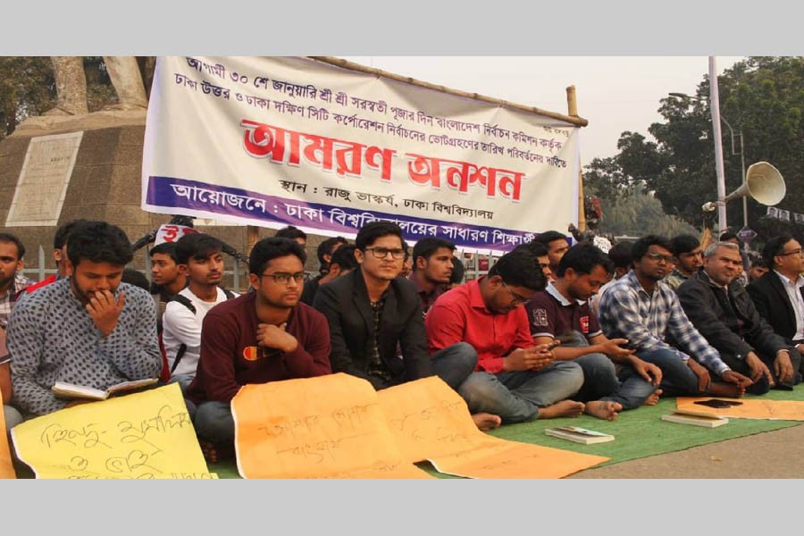 At least 10 students of Dhaka University (DU) fell sick on the second day of their fast unto death on Friday afternoon demanding deferment of the polls to the two Dhaka city corporations slated for January 30.