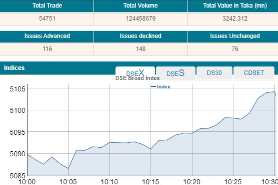 DSEX, the prime index of the DSE, went up by 9.36 points or 0.18 per cent to reach 5,104 points at 10:30 am.