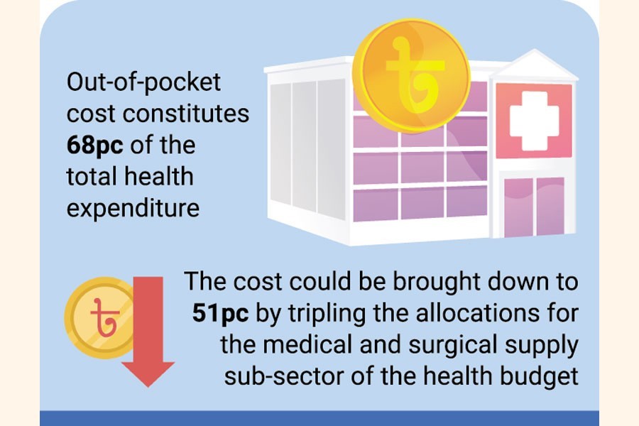 In his paper, Dr Rahman pointed out that the share of the out-of-pocket cost could be brought down to 51 per cent from 68 per cent by tripling the allocations for the medical and surgical supply sub-sector of the health budget and by filling up all the vacancies at the upazila health complexes, union health sub-centres and community clinics.